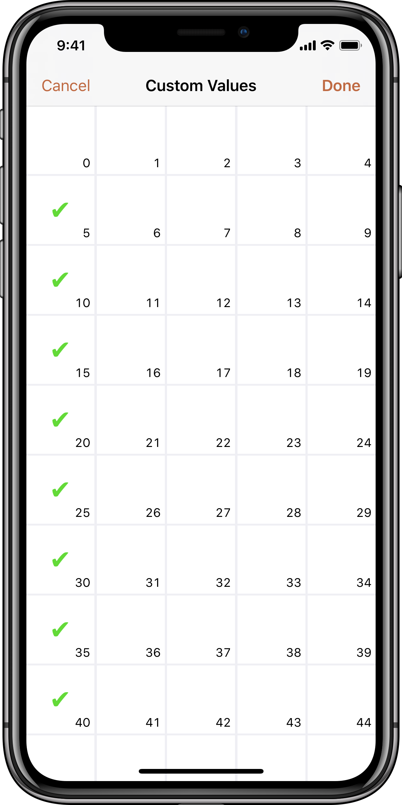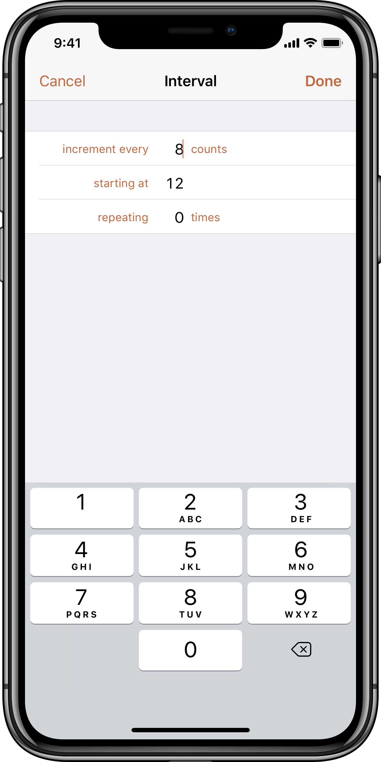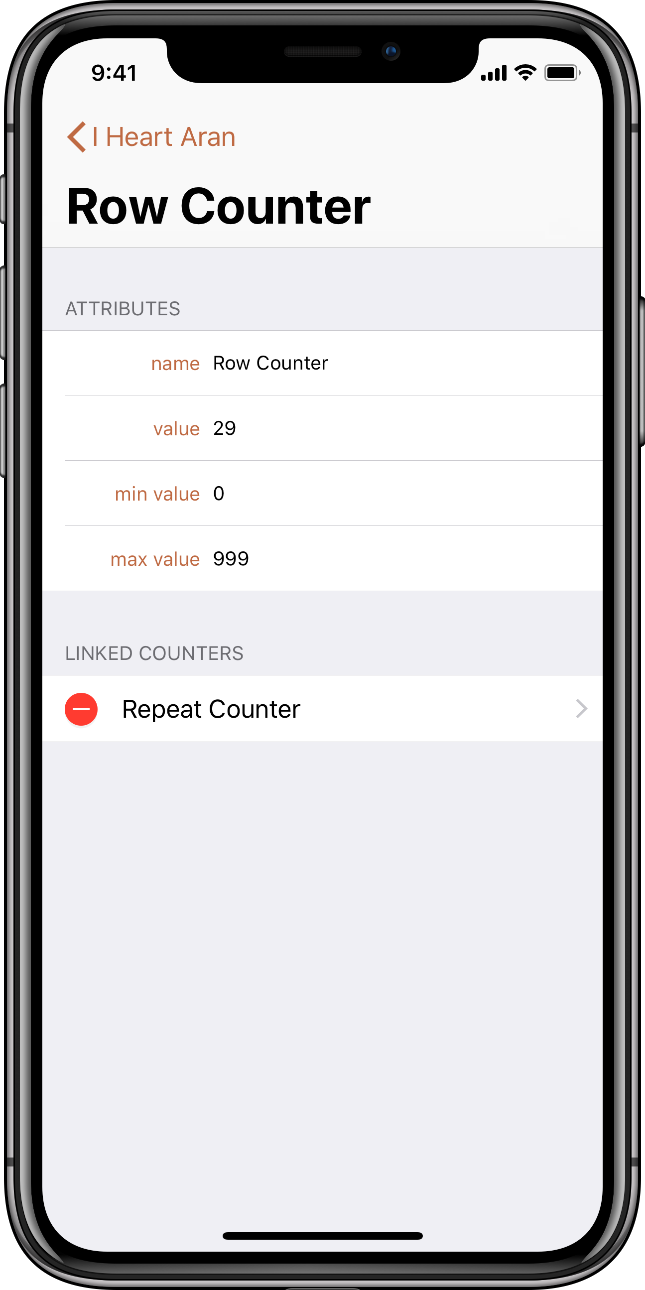Projects in Knit Counter can include as many counters as you need, and each counter has a user-editable name, starting value, and maximum value.
