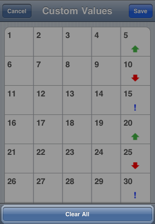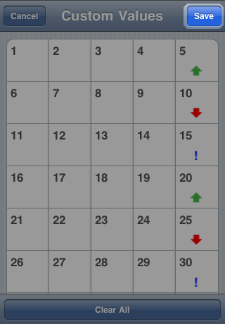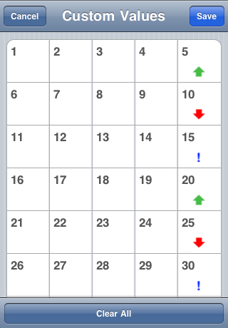 You'll be presented with a numbered grid. The squares in the grid correspond to your project's rows. For this example we'll set increase markers for rows 5 and 20, decrease markers for rows 10 and 25, and general alert markers for rows 15 and 30.