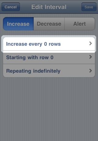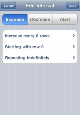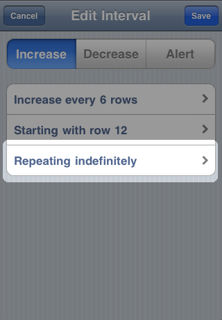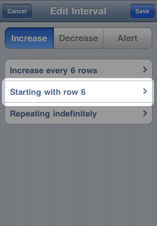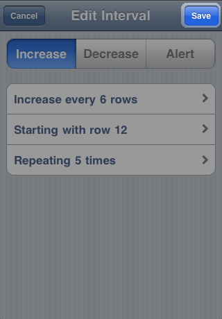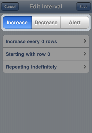 As an example, we'll set up a marker for an increase every 6 rows, starting from row 12, repeating 5 times. New markers default to being increase markers, but you can set them to be decrease or general alert markers by tapping the appropriate button at the top of the screen. Note that Knit Counter will not allow you to set markers that are beyond the row counter's limits. If you have a limit of 10 set on your row counter, "increment every" and "starting value" must be 11 or less. (It's 11, rather than 10, because when the row counter is at its limit of 10, you're at the beginning of the 11th row.)