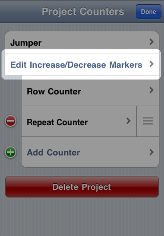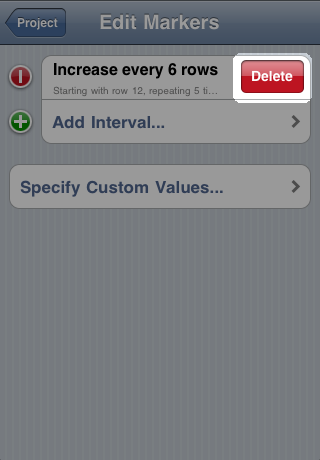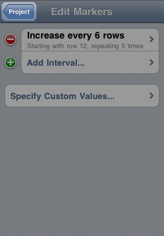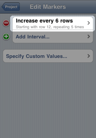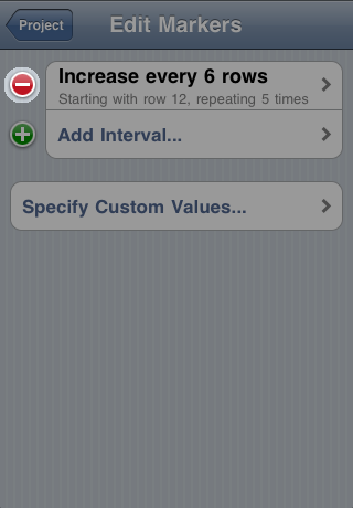 Tap once on a square to set an increase marker on it. Tap a second time to change the increase marker into a decrease marker. Tap a third time to change a decrease marker into a general alert marker. Tap a fourth time clear the marker for that row. Note that if you have added any periodic markers to your project they will be visible here, however periodic markers cannot be edited from the custom markers editor. Note that Knit Counter will not allow you to create links that are beyond the row counter's limit. If you have a limit of 10 set on the row counter, all of the grid squares above 11 will be disabled. (It's 11, rather than 10, because when the row counter is at its limit of 10, you're at the beginning of the 11th row.)