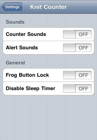 By default all of Knit Counter's settings are disabled. Settings can be enabled and disabled by tapping the On/Off button corresponding to the setting you wish to change.