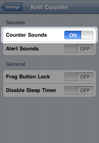 Setting "Counter Sounds" to "On" enables audible feedback when incrementing or frogging counters. This setting respects the iPhone's Ring/Silent switch status and thus Knit Counter will not play sounds if it is set to silent.