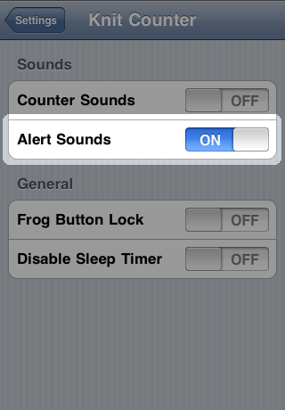 Setting "Alert Sounds" to "On" enables audible feedback when increase, decrease or general alert rows are reached. This setting respects the iPhone's Ring/Silent switch status and thus Knit Counter will not play sounds if it is set to silent.