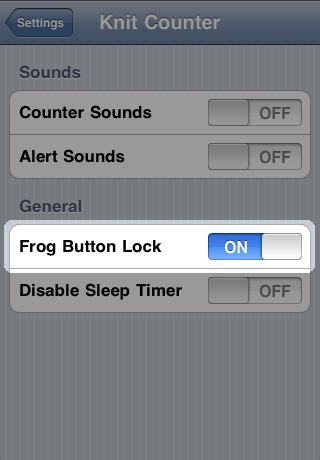 Setting "Frog Button Lock" to "On" changes the behaviour of Knit Counter's frog button so that a single tap of the frog button enables frogging, and a second tap disables it.