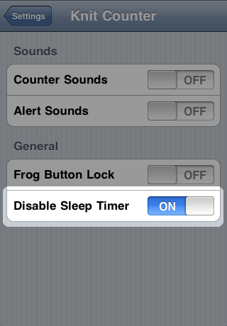 Setting "Disable Sleep Timer" to "On" prevents the screen on your iPhone or iPod from turning off when Knit Counter is running.